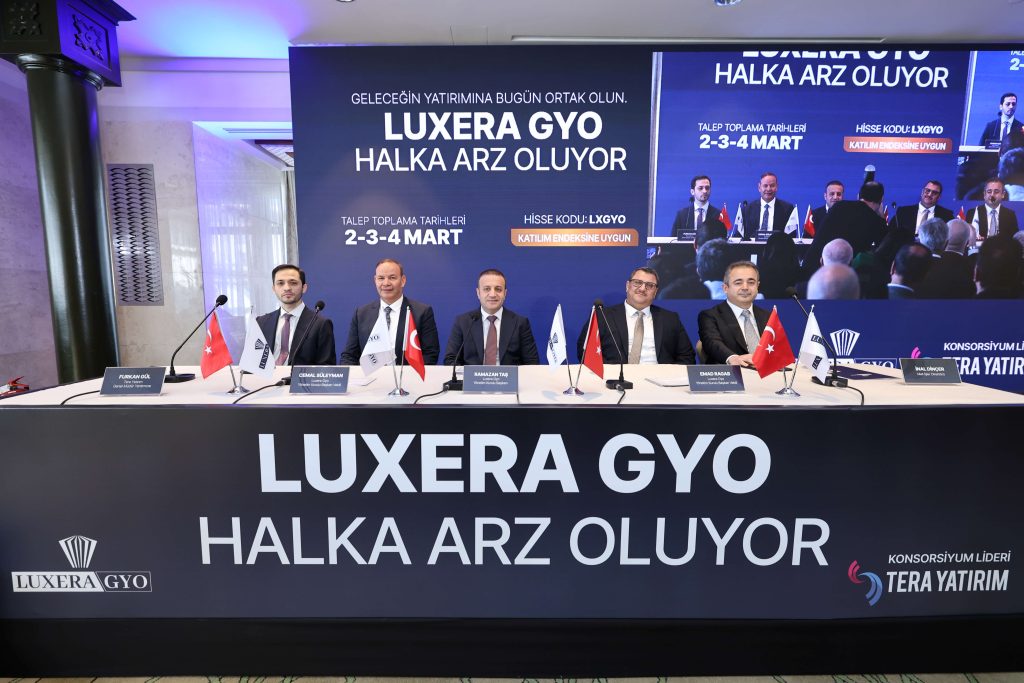 Türkiye’nin önde gelen gayrimenkul şirketlerinden Luxera GYO, konut sektöründeki birikimini sermaye piyasalarına taşımaya hazırlanıyor. 7 milyar TL’yi aşan portföy büyüklüğüne sahip şirketin halka arzında talep toplama tarihleri, 2-3-4 Mart olarak belirlendi. Luxera GYO, Tera Yatırım liderliğinde gerçekleşecek olan halka arzın detaylarını ve gelecek dönem planlarını düzenlediği bir basın toplantısıyla paylaştı. Toplantı Luxera GYO Yönetim Kurulu Başkanı Ramazan Taş, Yönetim Kurulu Başkan Vekili Emad Ragab, Yönetim Kurulu Üyesi Cemal Süleyman ve Tera Yatırım Genel Müdür Yardımcısı Furkan Gün’ün katılımıyla gerçekleştirildi.