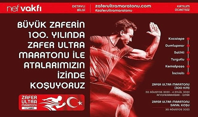 Her sene gelenekselleştirilmesi ve 100 yıl sonra yine Atatürk ve silah arkadaşlarının yolunda koşulması hedeflenen Zafer Ultra Maratonu, 30 Ağustos’ta Afyon Kocatepe Anıtı’ndan başlayıp Kütahya-Dumlupınar, Manisa-Salihli, Turgutlu ve İzmir- İnciraltı güzergahında devam edecek ve 4 Eylül’de İzmir’de, Büyük Taarruz ’un zaferle sona erdiği Cumhuriyet Meydanı’nda tamamlanacak.