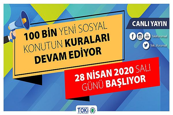 28 Nisan 2020 tarihinde yeniden başlayacak kura çekimleri TOKİ sosyal medya hesaplarından (Twitter, Facebook, YouTube) canlı olarak yayınlanacak. 28 Nisan 2020 Salı günü, Manisa Köprübaşı 75 konut, Manisa Akhisar 125 konut, Manisa Salihli 150 konut ve Denizli 118 konut projeleri için kura çekimleri gerçekleştirilecek.